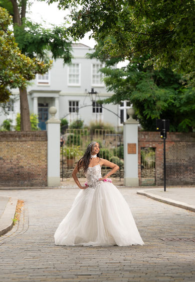 Style-Boned bodice with detachable off shoulder straps, Full A line skirt with or without 3D flower embellishment