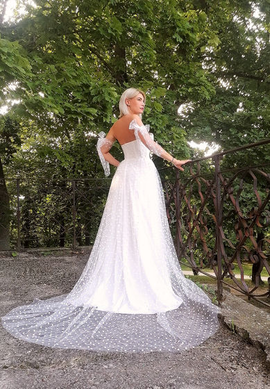Fabric-ivory crepe fabric with tulle sleeves and 3D flowers